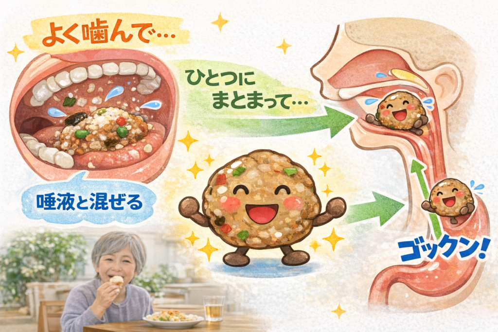 実は、食べ物は唾液と混ざって食塊になることで、喉の奥で「これは食べ物ですよ」と感知され、スムーズに飲み込めるようになります。