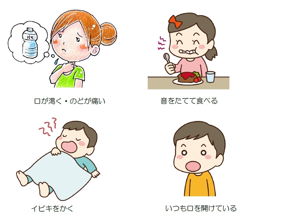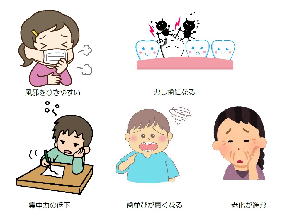 口呼吸でお口が乾燥すると、唾液の働きが弱くなり、虫歯や歯周病、口臭が起こりやすくなります。