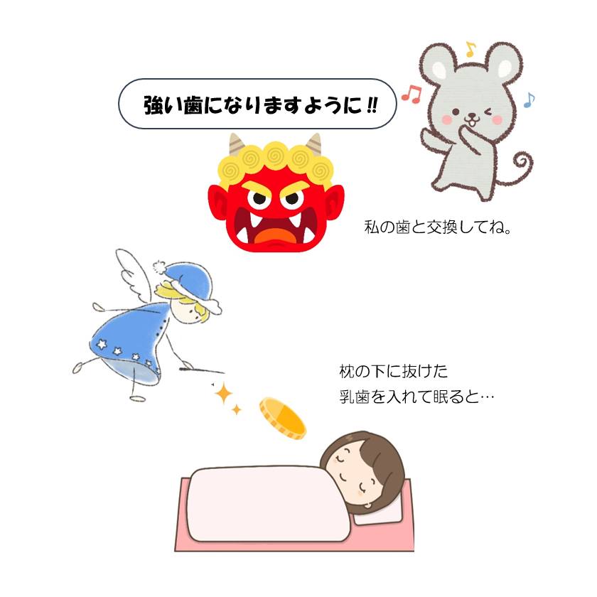 西洋では、乳歯が抜けたときに、その歯を枕元に置いて眠ると、夜中に歯の妖精「トゥースフェアリー」がこっそりやって来て、歯を持ち帰り、そのお礼にコインや小さなプレゼントを置いていってくれる、という言い伝えがあります。