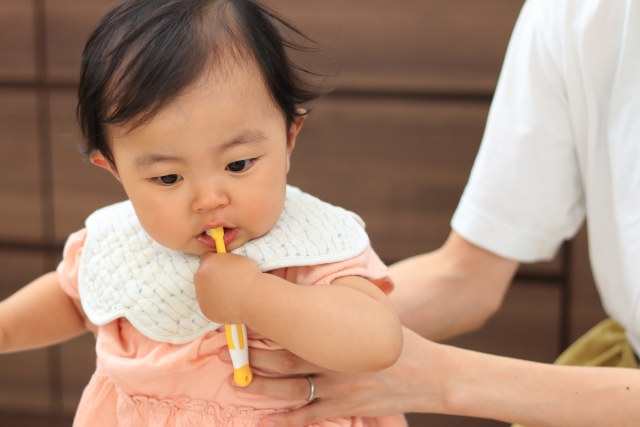 赤ちゃん自身が歯ブラシを持つことも大切ですが、実際には噛んでいるだけで十分に磨けていません。