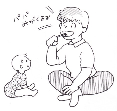 大人が一緒に歯みがきをして見せるのも効果的です。