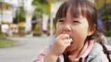 一方、大人は唇を閉じ、舌や歯を使ってかみ砕き、飲み込んでいます。