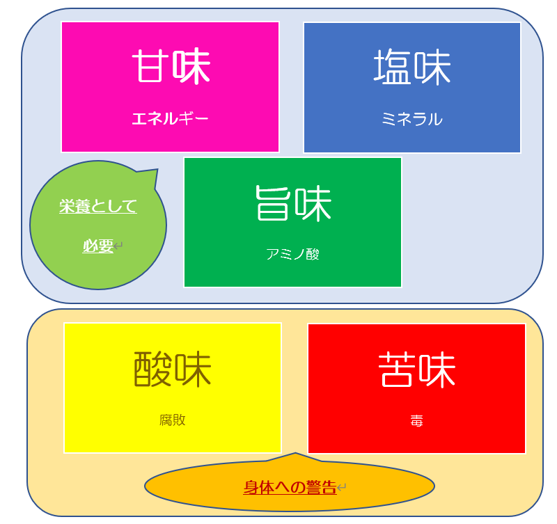 味には「甘味・塩味・旨味・酸味・苦味」の5つ(基本五味)があり、それぞれが体に必要な成分を見分けるための機能を持っています。